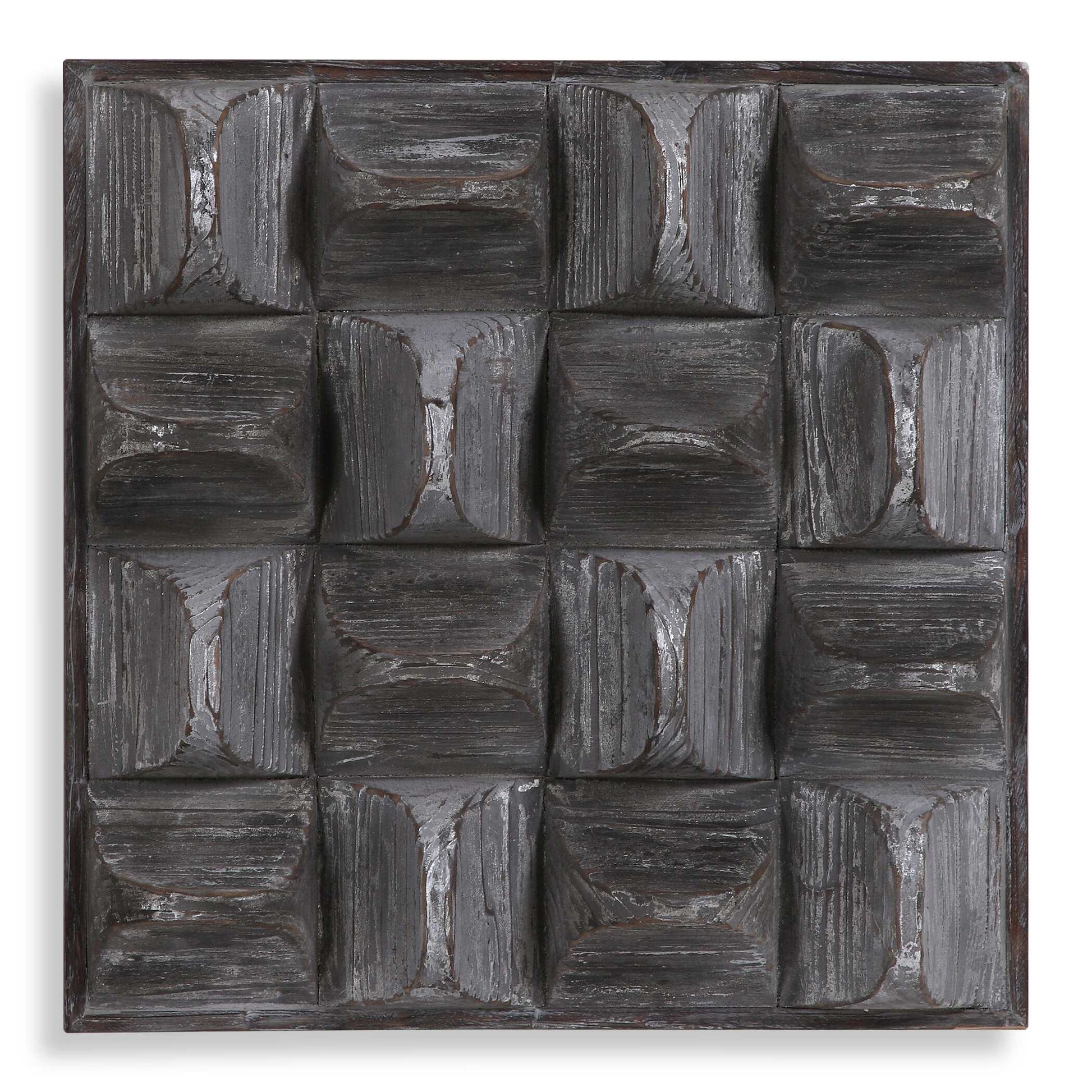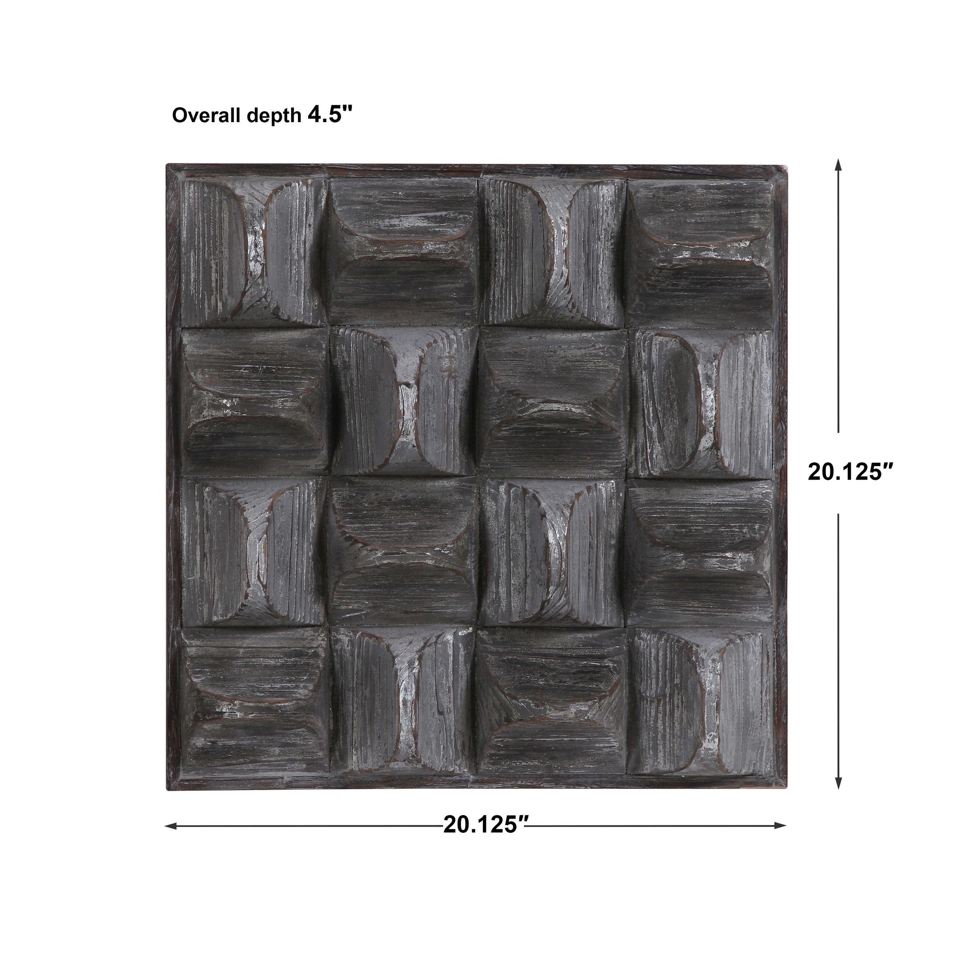 Version contemporaine du décor rustique, ce panneau mural en bois présente des blocs de bois de sapin creusés en 3D avec une patine grise vieillie et des reflets argentés.