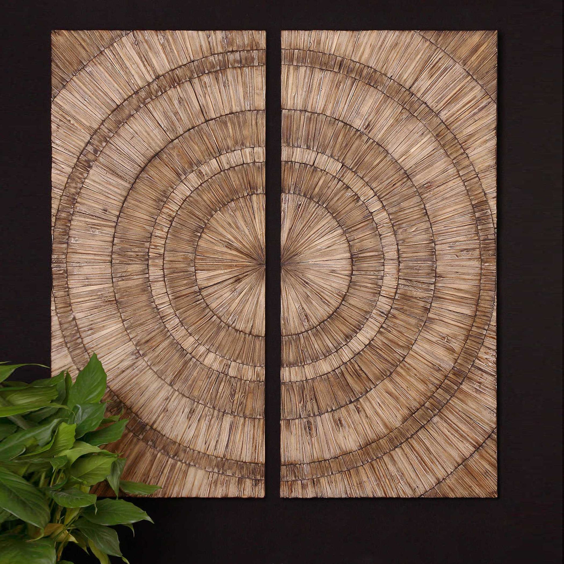 Des copeaux de bois naturel assemblés à la main et patinés sont utilisés pour créer cette élégante décoration murale.