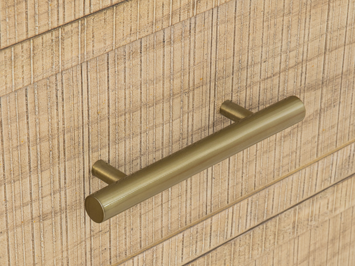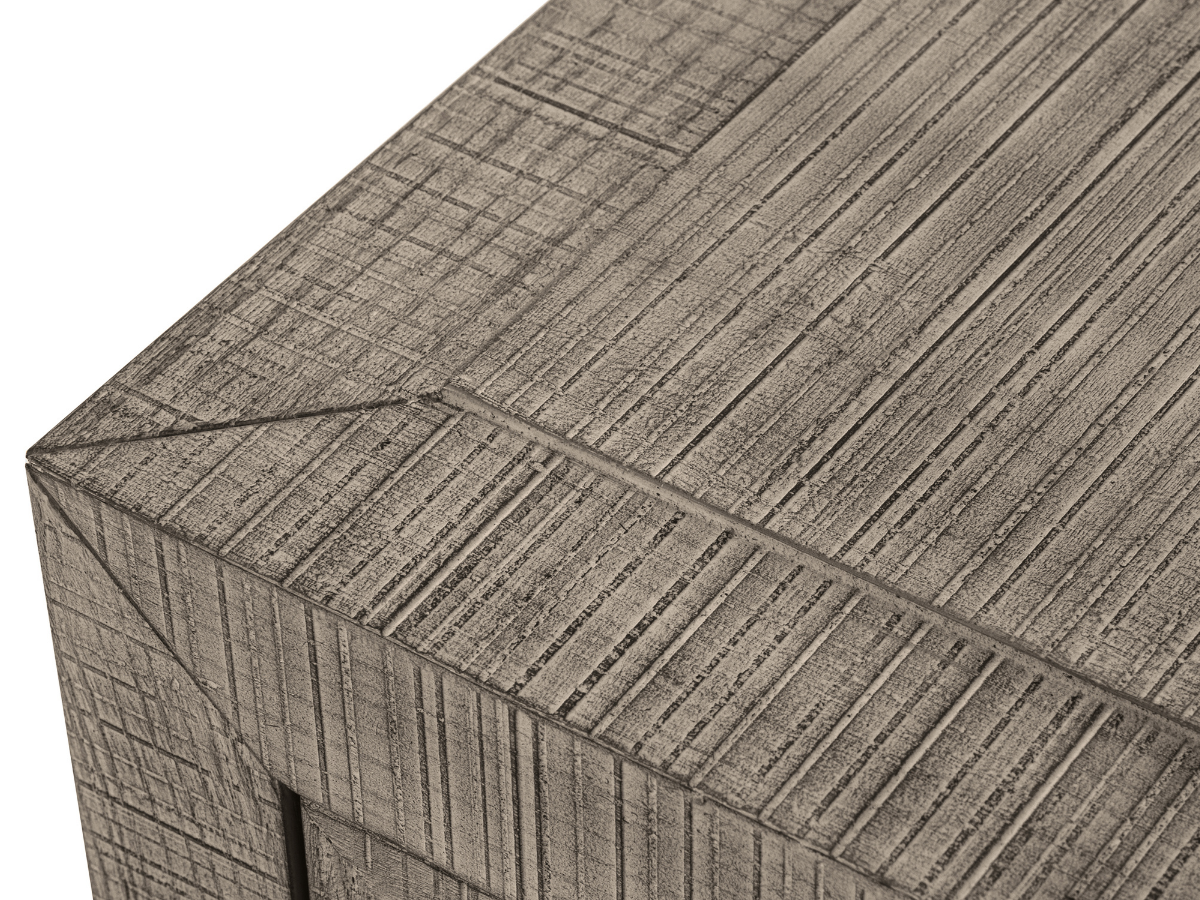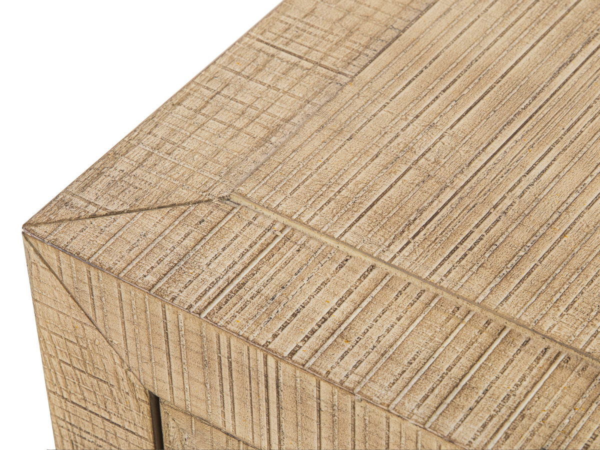 Lumineuse et aérée, la collection Bacara pour la chambre à coucher évoque la quiétude d'un séjour tropical. Les meubles en peuplier et acacia massifs sont revêtus d'un placage en frêne naturel à motif quadrillé, rappelant l'aspect du rotin. Un cadre de lit capitonné complète l'ensemble et souligne son atmosphère sereine.