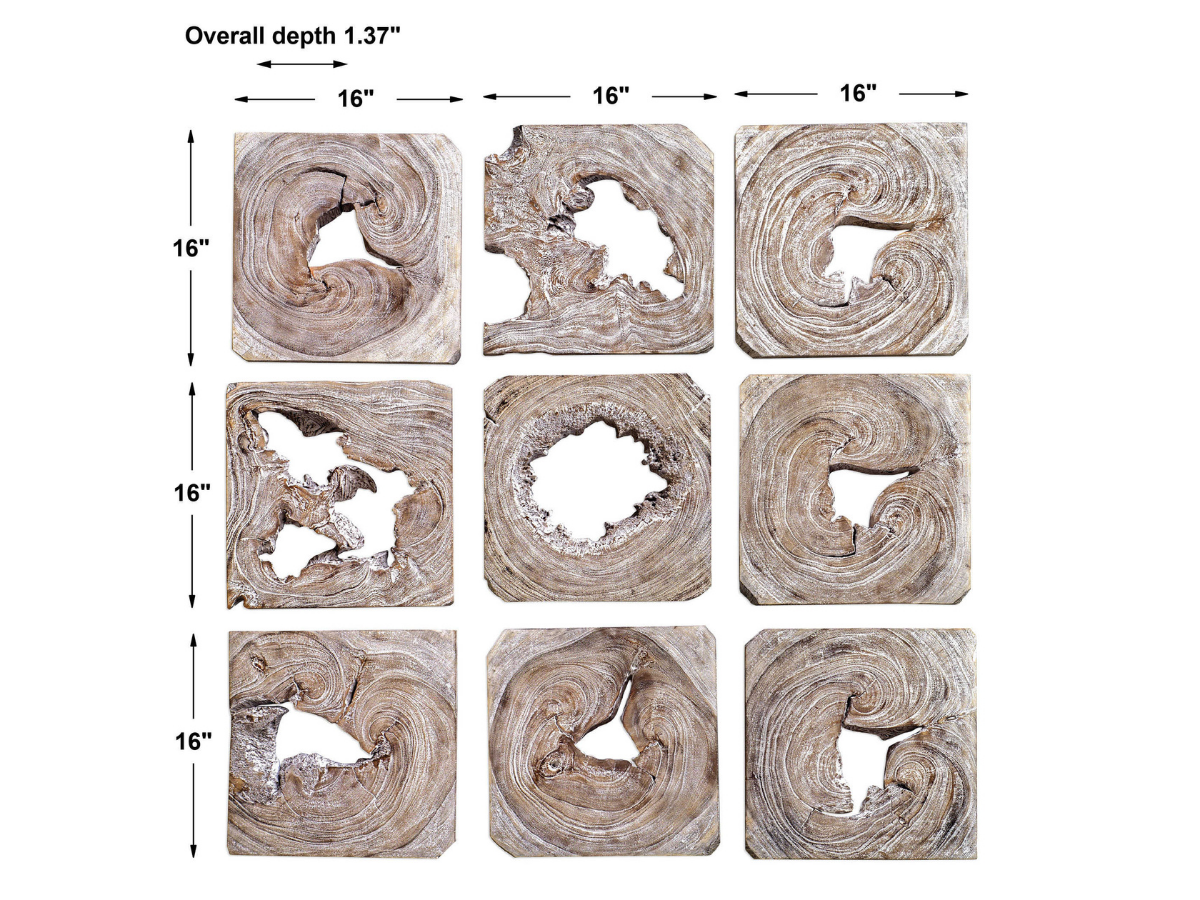 Cet ensemble de 9 tableaux en bois est réalisé en bois de suar massif naturel, finition ivoire blanchi aux nuances brun café. Chaque pièce étant fabriquée artisanalement, de légères variations naturelles peuvent apparaître.