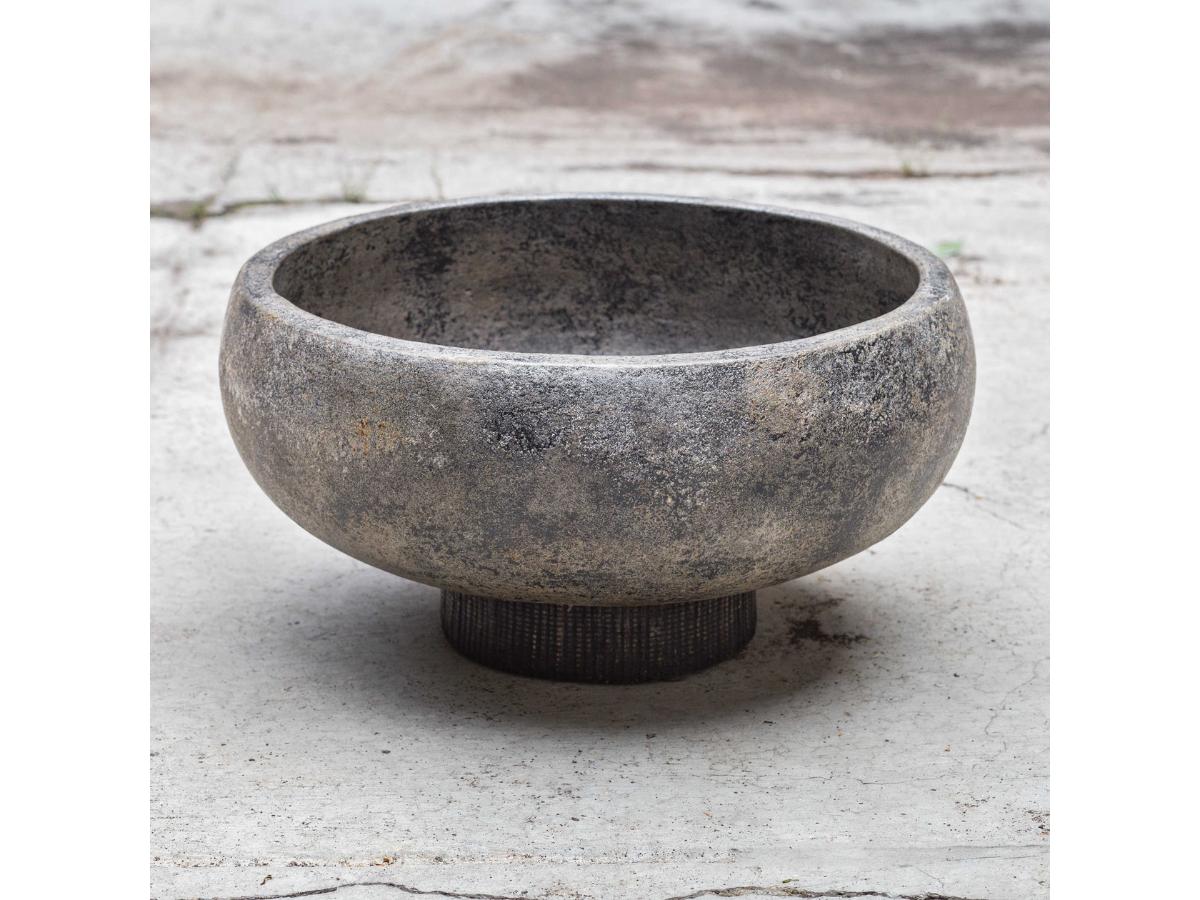 Bol en terre cuite à la finition noire vieillie avec des reflets dorés et agrémenté d'un socle recouvert de jacinthe d'eau.