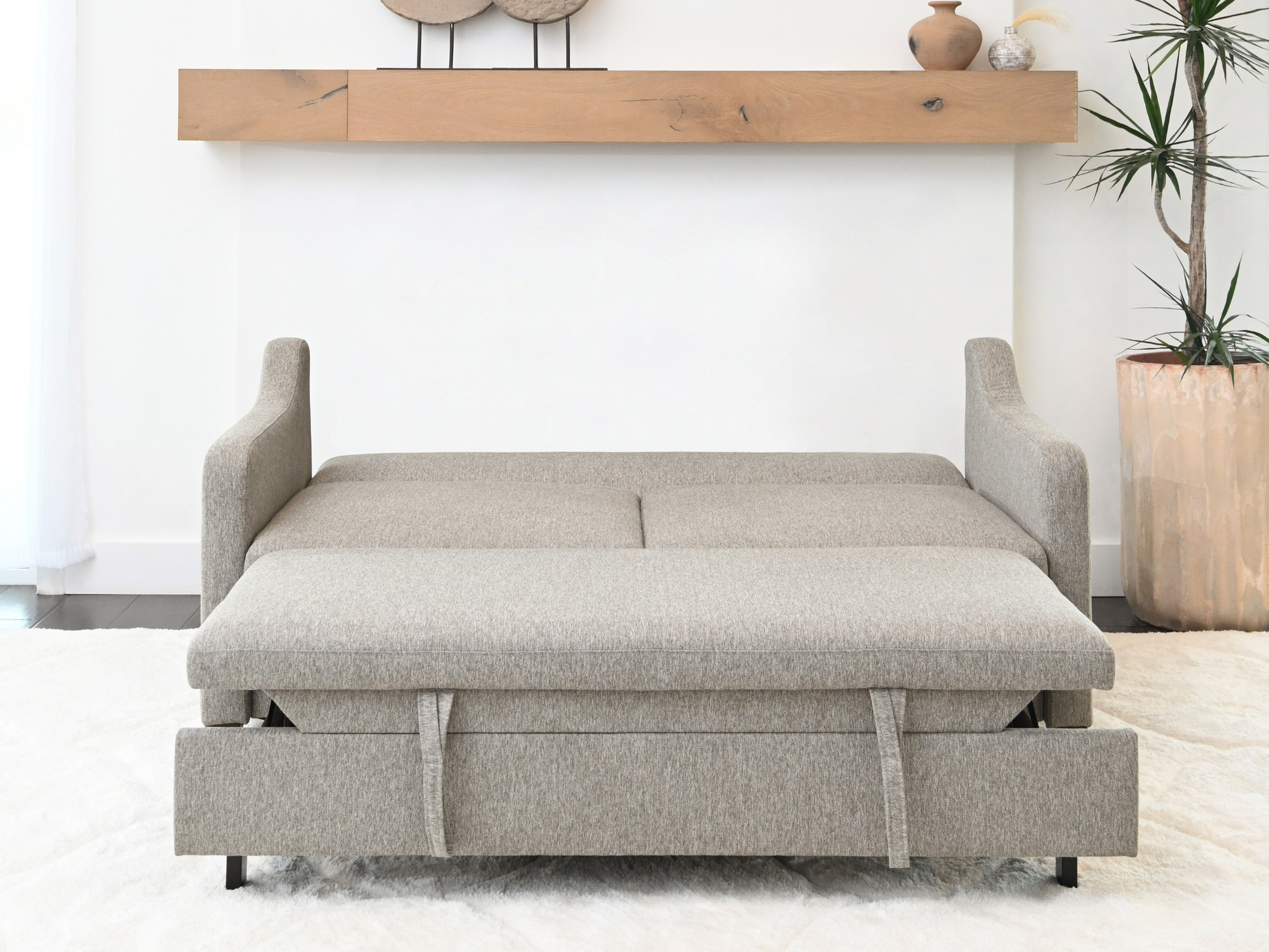 Dans un espace réduit, chaque centimètre compte et le canapé-lit Marley en tissu antitache est la solution idéale pour optimiser style et fonctionnalité. Parfait pour un salon ou un bureau, ce canapé se transforme en lit gigogne pour accueillir vos invités avec élégance et confort. En tant que canapé, il offre un confort exceptionnel grâce à ses coussins moelleux et son revêtement gris résistant aux taches, doux au toucher pour une ambiance chaleureuse. Son design classique, avec ses accoudoirs légèrement inclinés et ses coussins lisses, lui confère une allure sobre et épurée qui s'intègre harmonieusement à votre décoration sans l'encombrer. Des pieds foncés complètent son style. Un fauteuil-lit assorti de la collection Marley est vendu séparément pour créer un ensemble coordonné.