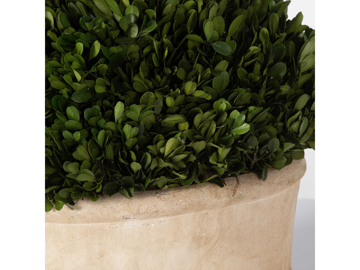 Conservé frais après la cueillette, le feuillage persistant naturel imite à la perfection le buis vivant, présenté dans des pots en terre cuite à l'aspect pierreux et moussu. Tailles : SM-